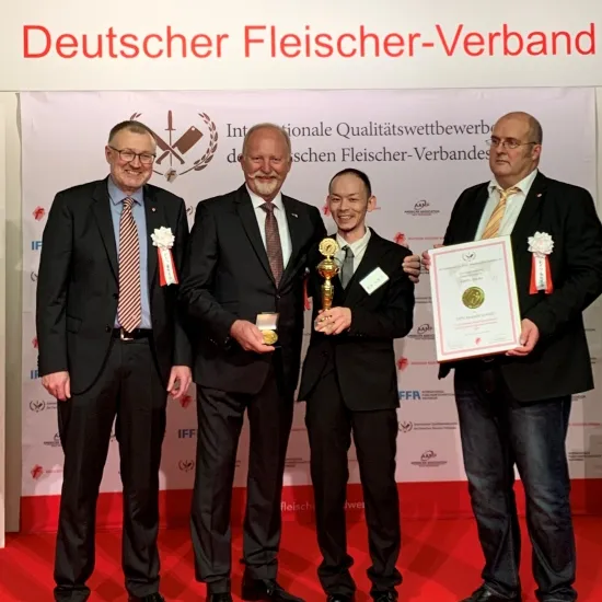 2019年大会は、アジア、アフリカからの食肉関係輸入禁止により、本場ドイツでの審査会はできませんでしたが、小野商事が事務局となり、食肉マイスターを日本に呼び本場ドイツで行われる審査と同様に「日本IFFAコンテスト」を開催しました。100以上の審査項目がある中で、満点のみ金賞という非常に厳しいコンテストですが、おかげさまでGris Hause NAGASEでは出品した7品目中、金賞5品、銀賞2品を受賞しました。また、金賞を4つ以上獲ったところには特別賞としてトロフィーまでいただけました。